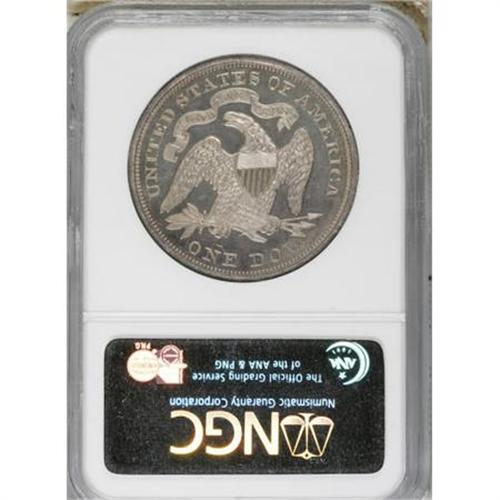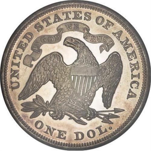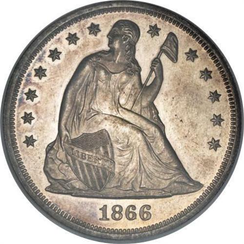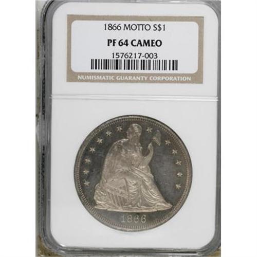 <B>1866 $1 Motto PR64 Cameo NGC.</B></I> This is an appealing near-Gem Cameo specimen of the 1866 dollar. Just 725 proofs were minted, from the new design bearing the inscription IN GOD WE TRUST (the Civil War had increased the religious fervor of Americans). This piece shows reflective mirrors, mildly frosted devices, and light, original toning. Faint hairlines limit the grade. Census: 15 in 64 Cameo, 15 finer (12/07). <BR><BR><b>Shipping:</b> Coins & Currency (<a target="_blank" href="http://www.heritageauctions.com/common/shipping.php">view shipping information</a>)