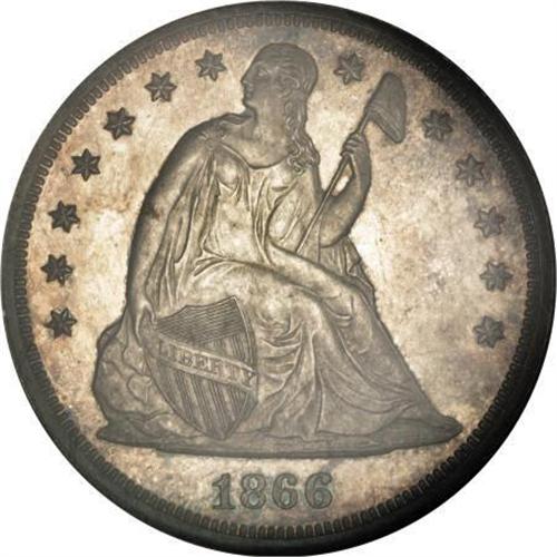<B>1866 $1 Motto PR65 NGC.</B></I> Mottled steel-gray and golden-rose toning envelops the obverse while flashes of orange-gold color appear about the devices on the livelier reverse. A significant degree of contrast is visible beneath the layers of toning. The premier proof delivery of the new Motto Seated Dollar type, the 1866 was produced to the extent of 725 pieces, all of which were distributed with the year's silver proof sets. While survivors are not particularly rare in an absolute sense, they are subjected to quite a bit of pressure from date collectors due to the scarcity of the business strike 1866. Of course, Gem specimens represent a very small percentage, perhaps as little a five percent, of the original production. Census: 18 in 65, 5 finer (12/07).<BR><BR><B>Coin Engraver:</B> Christian Gobrecht<BR><BR><b>Shipping:</b> Coins & Currency (<a target="_blank" href="http://www.heritageauctions.com/common/shipping.php">view shipping information</a>)