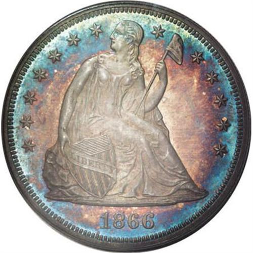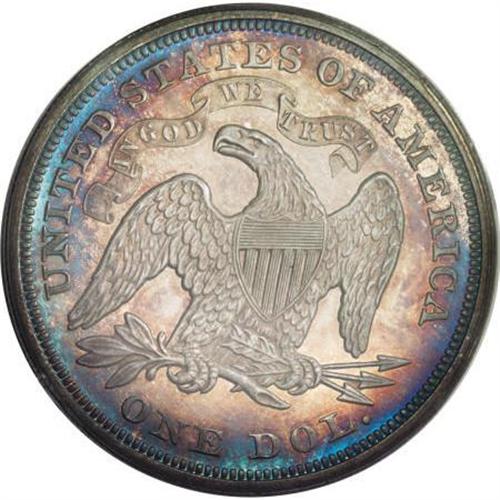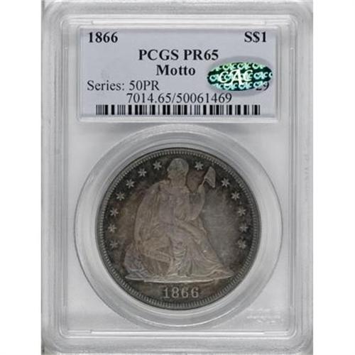 <B>1866 $1 Motto PR65 PCGS. CAC.</B></I> An amazing 1866 proof Seated dollar exhibiting fully original toning. Both sides display subtle grayish-gold at the centers, graduating to vivid lilac, cobalt-blue, and sea-green near the borders. The effect is stunning. The date is nicely centered in the exergue, with the shield point over the extreme left tip of the serif of the 1. Several letters of the motto are slightly doubled, most noticeably the G in GOD and W in WE. A thin raised die line extends diagonally through N GOD. Population: 7 in 65, 2 finer (3/08).<BR><I>From The Good Humor Collection.</B></I><BR><BR><B>Coin Engraver:</B> Christian Gobrecht<BR><BR><b>Shipping:</b> Coins & Currency (<a target="_blank" href="http://www.heritageauctions.com/common/shipping.php">view shipping information</a>)