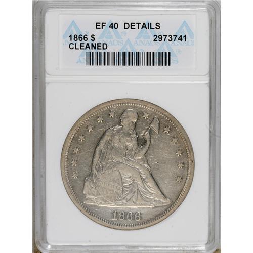<B>1866 $1 Motto --Cleaned--ANACS. XF40 Details.</B></I> NGC Census: (0/132). PCGS Population (5/109). Mintage: 48,900. Numismedia Wsl. Price for NGC/PCGS coin in XF40: $525. (#6959)<BR><BR><b>Shipping:</b> Coins & Currency (<a target="_blank" href="http://www.heritageauctions.com/common/shipping.php">view shipping information</a>)