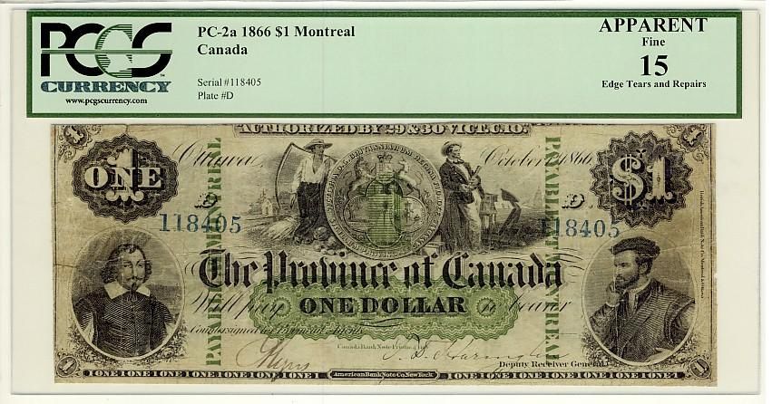 1866 $1 PC-2a #118405 PCGS F15. A very scarce early issue and rarely seen nicer. Minor edge tears and repairs but not distracting.