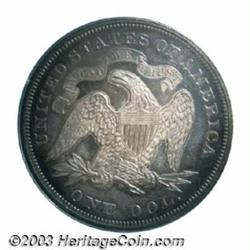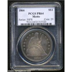 <table><tr><td><TABLE cellSpacing=0 cellPadding=0 width="100%" bgColor=#000000 border=0><TBODY> <TR><TD width="100%"><TABLE cellSpacing=1 cellPadding=3 width="100%" border=0><TBODY><TR><TD width="100%" bgColor=#79735c><FONT face=arial color=#ffffff size=3><B>Description</B> </FONT></TD></TR><TR><TD width="100%" bgColor=#ffffff><FONT face=arial size=2><B>1866 $1 PR64 PCGS.</B></I> The description in the Benson Collection catalog of this premier With Motto Seated Liberty Dollar proof reads: "Magnificent blue and rose gold toning throughout, perfectly arranged so the devices are highlighted. This is a very important coin, it is the first year of the new type with the addition of the motto "In God We Trust" on the reverse, and all but two clandestine 1866 dollars have the motto above the eagle. Close examination of the surfaces finds little to fault, the surfaces show virtually no signs of contact, and hairlines (if any) are faint at best...." <BR><I>Ex: Benson Collection, Part II (Ira & Larry Goldberg, 2/2002), lot 1216, which realized $10,925.</B></I> </FONT></TD></TR></TBODY></TABLE></TD></TR></TBODY></TABLE><BR><A name=PricesRealized></A><TABLE cellSpacing=0 cellPadding=0 width="100%" bgColor=#000000 border=0><TBODY><TR><TD width="100%"><TABLE cellSpacing=1 cellPadding=3 width="100%" border=0><TBODY><TR><TD width="100%" bgColor=#79735c><A name=PR><FONT face=arial color=#ffffff size=3><B>Previous Prices from Heritage Auctions</B> </FONT></A></TD></TR><TR><TD bgColor=#f6f6ed><TABLE cellSpacing=0 cellPadding=0 width="100%" border=1><TBODY><TR><TD align=middle width="33%"><B>Date</B></TD><TD align=middle width="33%"><B>Service</B></TD><TD align=middle width="33%"><B>Price</B></TD></TR><TR bgColor=whitesmoke><TD width="33%"><B>04/27/2002</B></TD><TD width="33%">NGC</TD><TD width="33%">$3,910.00</TD></TR><TR bgColor=whitesmoke><TD width="33%"><B>10/06/2000</B></TD><TD width="33%">NGC</TD><TD width="33%">$3,910.00</TD></TR><TR bgColor=whitesmoke><TD width="33%"><B>02/12/1999</B></TD><TD width="33%">PCGS</TD><TD width="33%">$4,600.00</TD></TR><TR bgColor=whitesmoke><TD width="33%"><B>01/10/1998</B></TD><TD width="33%">PCGS</TD><TD width="33%">$4,600.00</TD></TR><TR bgColor=whitesmoke><TD width="33%"><B>04/02/1993</B></TD><TD width="33%">PCGS</TD><TD width="33%">$4,400.00</TD></TR><TR bgColor=whitesmoke><TD width="33%"><B>02/18/2002</B></TD><TD width="33%">PCGS</TD><TD width="33%">$10,925.00</TD></TR><TR bgColor=whitesmoke><TD width="33%"><B>06/01/2001</B></TD><TD width="33%">PCGS</TD><TD width="33%">$4,571.00</TD></TR><TR bgColor=whitesmoke><TD width="33%"><B>05/01/1996</B></TD><TD width="33%">PCGS</TD><TD width="33%">$3,960.00</TD></TR><TR bgColor=whitesmoke><TD width="33%"><B>01/01/1999</B></TD><TD width="33%">PCGS</TD><TD width="33%">$6,900.00</TD></TR></TBODY></TABLE></TD></TR><TR><TD bgColor=#ffffff><FONT face=arial size=1 ?>PLEASE NOTE: All prices realized reflect the final hammer price PLUS the buyer's premium in auctions that charge a buyer's premium. Each item has a notation at the top of the listing indicating whether that lot included a buyer's premium. Example: A item that sells with a final hammer price of $100 and a 20% buyer's premium will display with a price realized of $120. All information listed is intended to be as accurate as possible, but errors are possible. Please use this guide carefully and inform us of any inaccuracies. </FONT></TD></TR></TBODY></TABLE></TD></TR></TBODY></TABLE><BR><TABLE cellSpacing=0 cellPadding=0 width="100%" bgColor=#000000 border=0><TBODY><TR><TD width="100%"><TABLE cellSpacing=1 cellPadding=3 width="100%" border=0><TBODY><TR><TD width="100%" bgColor=#79735c colSpan=6><FONT face=arial color=#ffffff size=3><B>Price Guide*</B> </FONT></TD></TR><TR bgColor=#f6f6ed><TD align=middle><B>Grade</B> </TD><TD align=middle><B>Coin World<BR>(Trends)</B> </TD><TD align=middle><B>Numismedia<BR>Retail</B> </TD><TD align=middle><B>Numismedia<BR>Wholesale</B> </TD><TD align=middle><B>Coin<BR>Universe</B> </TD><TD align=middle><B>Heritage<BR>Value Index</B> </TD></TR><TR bgColor=#ffffff><TD align=middle>63</TD><TD align=right>---</TD><TD align=right>---</TD><TD align=right>$2,625.00</TD><TD align=right>$3,250.00</TD><TD align=right>$2,397.00</TD></TR><TR style="FONT-WEIGHT: bold" bgColor=#cccfdd><TD align=middle>64</TD><TD align=right>---</TD><TD align=right>---</TD><TD align=right>$4,175.00</TD><TD align=right>$6,500.00</TD><TD align=right>$4,200.00</TD></TR><TR bgColor=#ffffff><TD align=middle>65</TD><TD align=right>---</TD><TD align=right>---</TD><TD align=right>$10,500.00</TD><TD align=right>$15,000.00</TD><TD align=right>$9,750.00</TD></TR><TR bgColor=#ffffff><TD colSpan=6><FONT size=1>*All information listed is intended to be as accurate as possible, but errors are possible. No item may be returned or refused based on this information which is provided as a service to our customers. You should contact each pricing source directly to determine the accuracy of this information. </FONT></TD></TR></TBODY></TABLE></TD></TR></TBODY></TABLE><BR><TABLE cellSpacing=0 cellPadding=0 width="100%" bgColor=#000000 border=0><TBODY><TR><TD width="100%"><TABLE cellSpacing=1 cellPadding=3 width="100%" border=0><TBODY><TR><TD width="100%" bgColor=#79735c><FONT face=arial color=#ffffff size=3><B>Population Guide</B> </FONT></TD></TR><TR bgColor=#ffffff><TD align=middle><!-- Begin Output of Population Grid--><TABLE cellSpacing=0 cellPadding=0 width="100%" border=0><TBODY><TR><TD vAlign=center><TABLE cellSpacing=0 width="100%" border=1 cellsadding="3"><TBODY><TR><TD vAlign=center><TABLE cellSpacing=0 cellPadding=3 width="100%" border=1><TBODY><TR><TD vAlign=center align=middle bgColor=#f0f1e8 colSpan=2 <CENTER><FONT face=Arial size=2><B>PCGS Pop </B></FONT><CENTER></CENTER></TD><TD vAlign=center align=middle bgColor=#f0f1e8 colSpan=2><CENTER><FONT face=Arial size=2><B>NGC Pop</B></CENTER></FONT></TD></TR><TR><TD vAlign=center><FONT face=Arial size=2>(64)</FONT> </TD><TD vAlign=ce