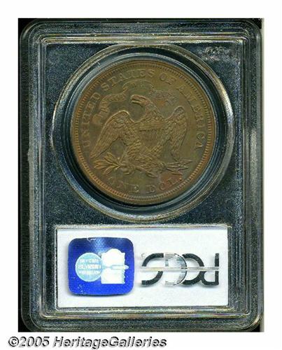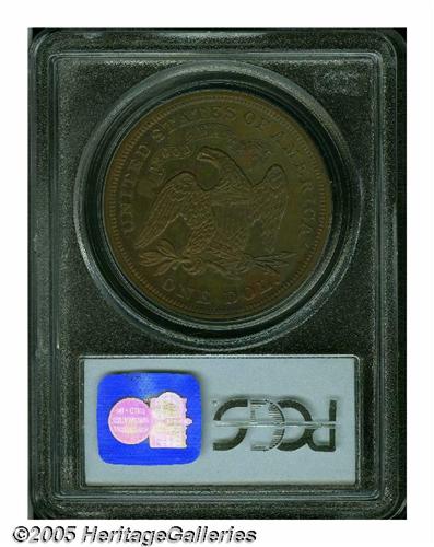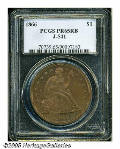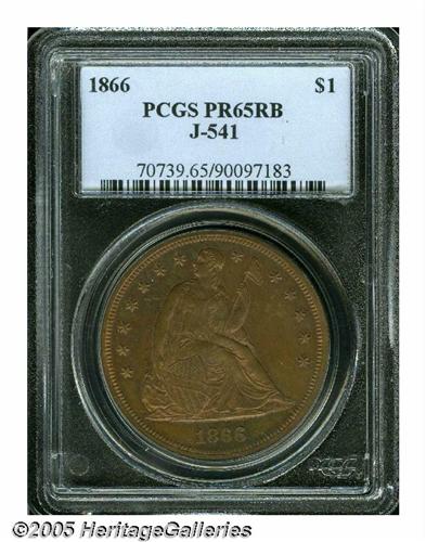 <B>1866<$1> Seated Dollar, Judd-541, Pollock-606, Low R.6, PR65 Red and Brown PCGS.</B></I> The regular dies With Motto Seated Dollar design, first commercially used in this transitional year. Struck in copper with a reeded edge. Both sides are predominately a deep pumpkin-orange color with rose-violet overtones. There are just a few well scattered obverse carbon flecks over modestly mirrored surfaces. The strike is unimprovably sharp. The reverse is multiply die doubled north, best observed on IN GOD WE TRUST.