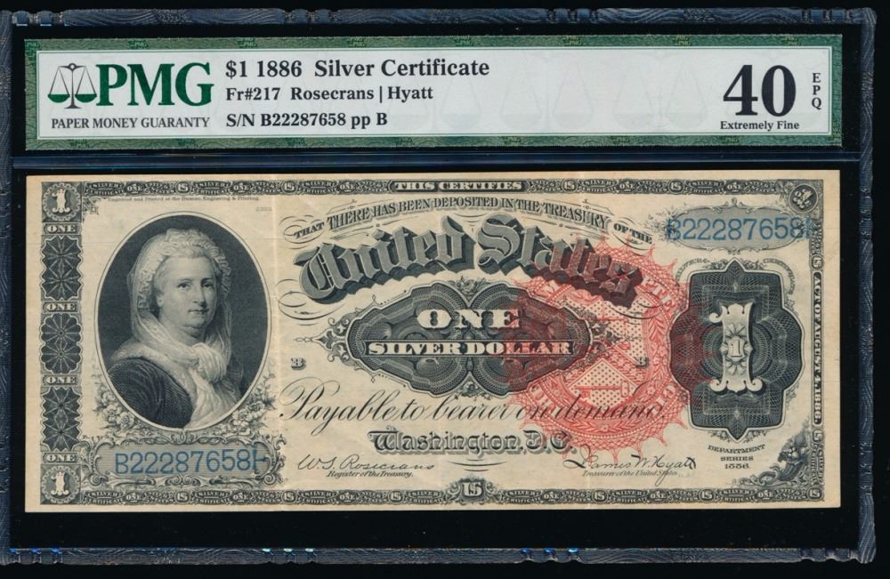 One 1866 $1 Silver Certificate PMG 40EPQ.