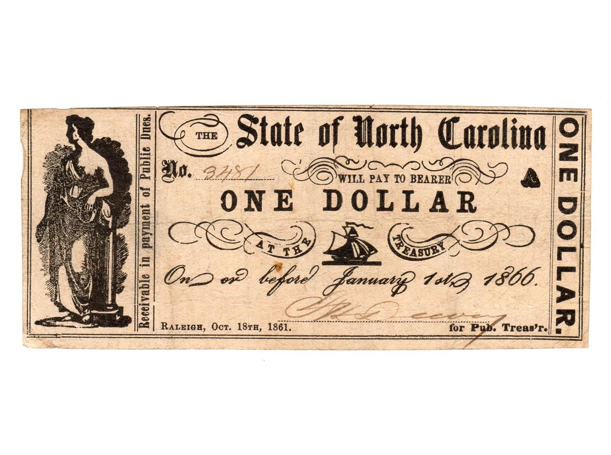 One 1866 $1 State of North Carolina Obsolete Bank Note.