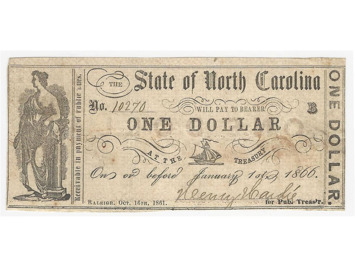 One 1866 $1 The State of North Carolina Obsolete Bank Note.