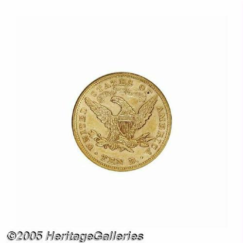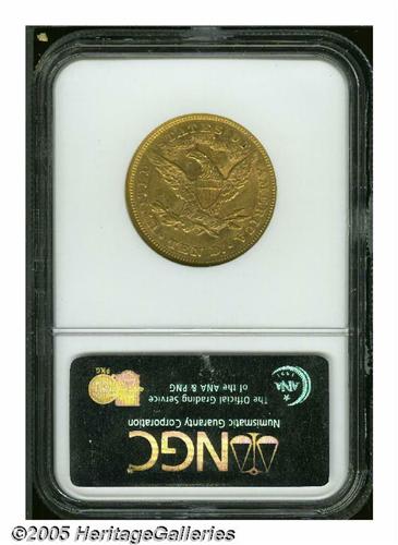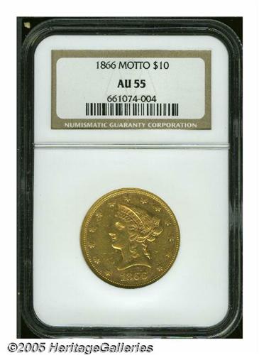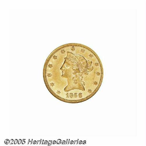 <B>1866<$10> AU55 NGC.</B></I> Mostly brilliant surfaces with wisps of amber-gold. Traces of satiny luster can be seen around the motifs, stars, letters, and numerals. The presently-offered example is distinguished by a nick on Liberty's cheek as illustrated. Only 3,780 examples of the variety were minted and survivors are scarce in all states or preservation. Most offered are in the VF to XF grade range. David Akers was able to account for just three AU examples when he wrote his book on eagles back in 1979. Significantly, there were absolutely no Uncirculated specimens offered in the 369 major auction sales that he included in his survey. Population: 11 in 55, 3 finer (6/05).