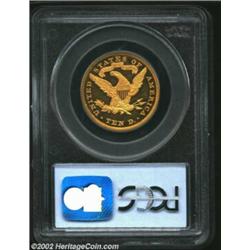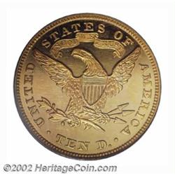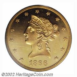 1866 $10 Motto PR63 Deep Cameo PCGS. First year of issue for the With Motto design and of added significance to type collectors as such. Only 30 proofs were struck, and Akers estimates that possibly 10-12 pieces survive--an estimate that still seems reasonable 25 years later. This is an exceptionally attractive cameo proof that exhibits strong cameo contrast on each side. The fields are lightly hairlined, which accounts for the technical grade, but the coin's appearance is much stronger than the technical grade can account for. This is the only PR63 cameo certified by either of the major services to date with none finer (9/02). Important notice: We expect to be auctioning lots at the rate of 200-250 per hour. Sometimes eBay Premier live bid software cannot keep up with that pace, so we strongly recommend that you place a realistic proxy bid now as insurance to avoid disappointment. Also please note that all Heritage/CAA lots purchased through eBay Premier carry a 20% Buyer's Premium. Please make sure you read the Terms and Conditions.