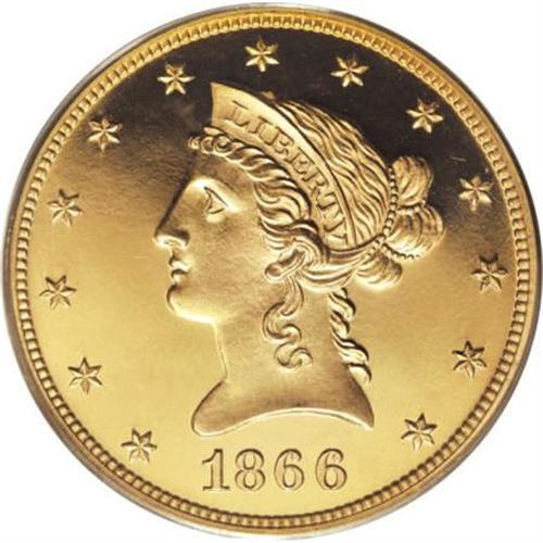 <B>1866 $10 PR65 PCGS.</B></I> This year, 1866, is one of the pivotal dates in numismatics. It is in a small group of dates that need little or no explanation: 1840, 1873, 1907, and 1916. When the Reverend M.R. Watkinson urged Treasury Secretary Salmon P. Chase in 1863 to add some reference to God to U.S. coins he could not have known how far-reaching his request was. Undoubtedly because of the million men killed in the Civil War, and the nation's subsequent need to believe that a million men died for something, Chase gave the idea of such a motto consideration and signed an act on March 3, 1865 to include the motto on coinage. A number of patterns resulted, and the following year saw IN GOD WE TRUST added to the reverse of many U.S. coins. This created a distinctly different reverse design type, and 1866 has traditionally been used as a dividing point for the denominations where the motto was added.<BR> Only 30 proofs were struck of the 1866 ten dollar, a mintage that is consistent with other years from the 1860s through the 1880s. However, very few of those 30 proofs are known today. Akers (1980) estimated 10-12 pieces remain. Breen (1988) stated he believed only 8-10 survived. It appears that Breen's estimate may have been closer to the mark. Adding non-Cameo, Cameo, and Deep/Ultra Cameo coins together only yields 11 submission events. Undoubtedly, several of those are resubmissions, bringing the total known probably down to the 8-10 range. <BR> This is the finest of the three non-Cameo proofs that have been certified. The next closest coins are a pair of PR62 pieces. Among Cameo and Deep/Ultra Cameo pieces, there is one Cameo PR65, one Cameo PR66, and one PR66 Ultra Cameo. <BR> Apparently this coin has been in the same collection for many years. We would guess at least as many years as the grading services have designated Cameo and Deep/Ultra Cameo, because this coin is an obvious cameo. The fields show the expected deep reflectivity one would expect from a proof. What is unexpected, however, is the thick mint frost that sets up such a strong white-on-black contrast. Pinpoint striking definition is also noted on all the design elements. The surfaces are lacking in any mentionable or noticeable flaws that might be useful for tracing the pedigree of this important piece of proof gold.<BR><BR> <BR><BR><B>Coin Engraver:</B> Christian Gobrecht<BR><BR><b>Shipping:</b> Coins & Currency (<a target="_blank" href="http://www.heritageauctions.com/common/shipping.php">view shipping information</a>\)