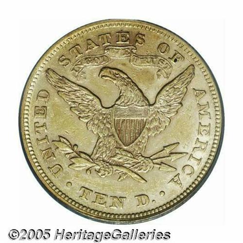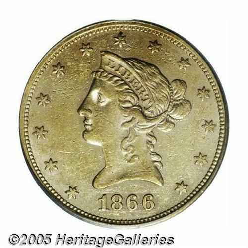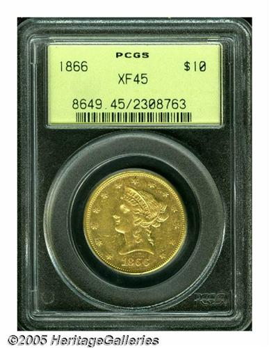 <B>1866<$10> XF45 PCGS.</B></I> A very scarce first year of issue for the With Motto design Coronet Eagle, one of a mere 3,780 business strikes issued. This median grade example shows a slight softness of strike on Liberty's curls and a number of small to moderate sized abrasions overall. Just the faintest glimmer of an original prooflike surface can still be seen surrounding the devices. Population: 8 in 45, 12 finer (5/05).