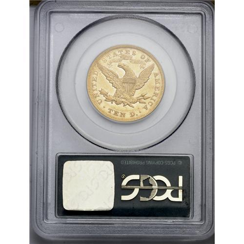 <B>1866<$10> XF45 PCGS.</B></I> As is always seen, all four of the digits of the date show pronounced doubling from having been recut. This reinforces the fact that only one obverse die was used to strike the paltry mintage of 3,780 pieces. This piece is above average for the issue displaying pleasing medium orange-gold color and slight softness of strike at the obverse border. There are a number of small marks overall, but overall the coin has a desirable, bright appearance. A very scarce first year of issue for the With Motto design Coronet ten that is housed in an early PCGS holder with a green insert. Population: 7 in 45, 12 finer (5/06).