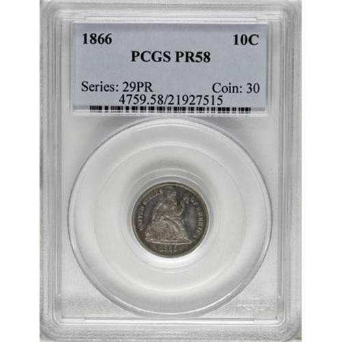<B>1866 10C PR58 PCGS.</B></I> PCGS Population (2/124). NGC Census: (0/119). Mintage: 725. (#4759)<BR><BR><B>Coin Engraver:</B> Christian Gobrecht<BR><BR><b>Shipping:</b> Coins & Currency (<a target="_blank" href="http://www.heritageauctions.com/common/shipping.php">view shipping information</a>)