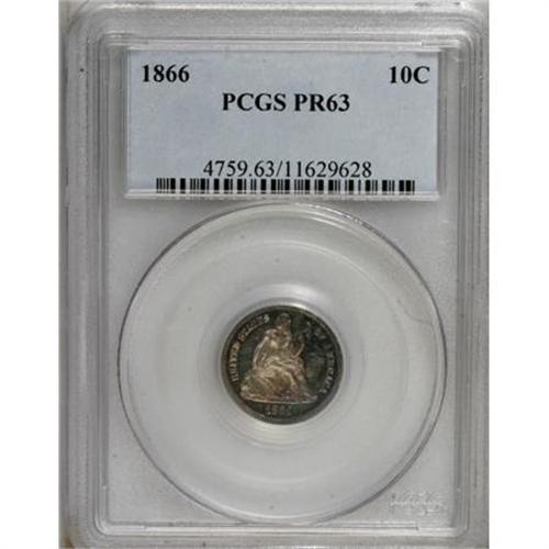 <B>1866 10C PR63 PCGS.</B></I> PCGS Population (42/51). NGC Census: (31/74). Mintage: 725. Numismedia Wsl. Price for NGC/PCGS coin in PR63: $610. (#4759)<BR><BR><B>Coin Engraver:</B> Christian Gobrecht<BR><BR><b>Shipping:</b> Coins & Currency (<a target="_blank" href="http://www.heritageauctions.com/common/shipping.php">view shipping information</a>)