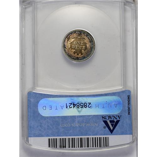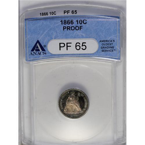 <B>1866<10C> PR65 ANACS.</B></I> This beautifully toned post-Civil War Gem has deeply mirrored blue and violet fields around orange-yellow centers. The fields and devices have some contrast.<BR><I>Ex: John L. Harris Collection (Stack's, 11/50), lot 346.</B></I><BR><I>From The Redfjord Collection.</B></I>
