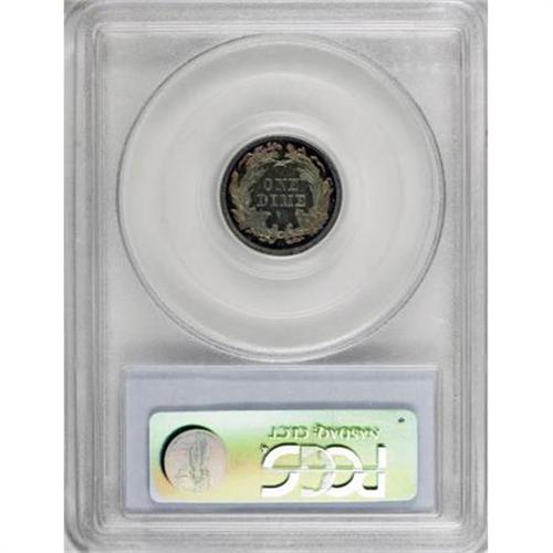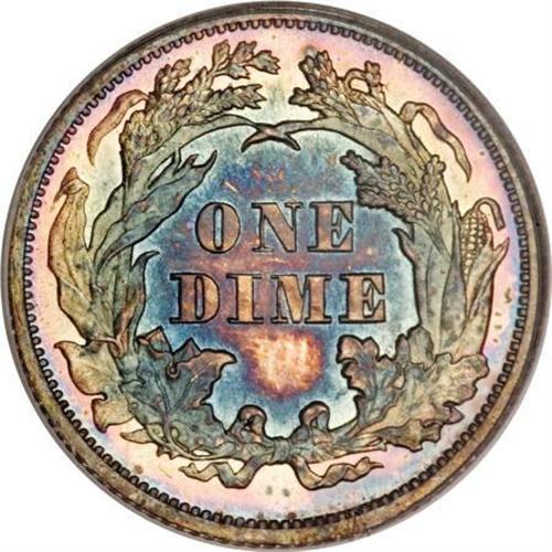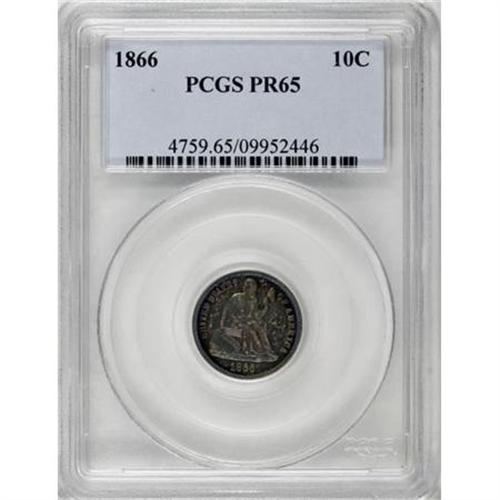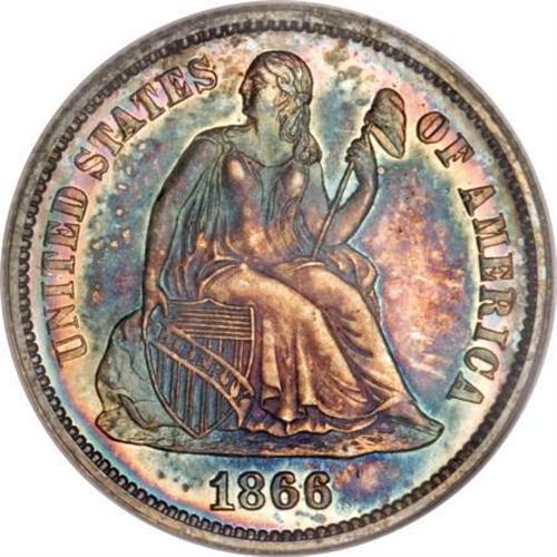 <B>1866 10C PR65 PCGS.</B></I> A medley of aqua-blue, purple, and golden-brown toning covers carefully preserved surfaces that exhibit some field-device contrast. Sharply defined, befitting of a proof strike. This Gem possesses great overall eye appeal. Population: 14 in 65, 5 finer (3/08).<BR><BR><B>Coin Engraver:</B> Christian Gobrecht<BR><BR><b>Shipping:</b> Coins & Currency (<a target="_blank" href="http://www.heritageauctions.com/common/shipping.php">view shipping information</a>)