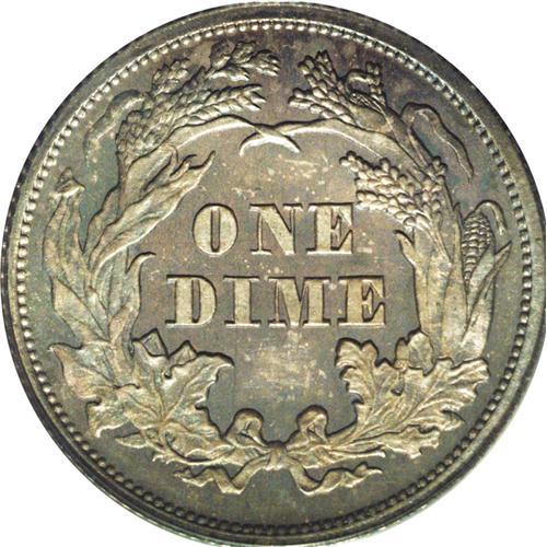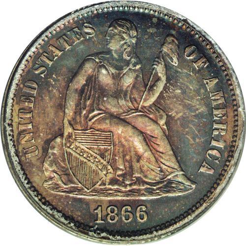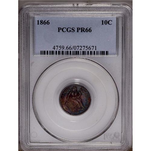 <B>1866<10C> PR66 PCGS.</B></I> While this date has the highest proof mintage of the 1863-1867 era, and is more available than for the other dates (Greer 1992), PR66 and finer coins are far and few in between. Indeed, PCGS and NGC have certified only 16 Premium Gems and nine specimens finer (4/06). this piece displays deep cobalt-blue and crimson toning, which is slightly more vibrant on the obverse. Sharply struck, and a couple of small marks on Liberty's cheek are mentioned for accuracy.
