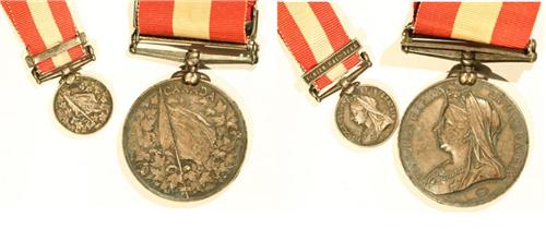 Canadian General Service Award medals were granted to all officers who were employed actively in repelling the Fenian Raids on the Canadian frontier in 1866 and 1870 or who engaged in the Red River Expedition of 1870. Not issued until 1899 and awarded only if applied for. The 2 small pieces include a 12mm diameter silver and a large 36mm diameter silver circular medal mounted on plain straight swivelling suspenders attached with a double-toe claw. Obverses, veiled diademed bust of Queen Victoria and Legend VICTORIA REGINA ET IMPERATRIX. Reverse depicts the old Canadian ensign within a wreath of maple with 'CANADA' above. Bars issued: Fenian Raid 1866 and Fenian Raid 1870. Hung on a 15mm and 30mm ribbon respectively consisting of 3 equal stripes; red, white and red. The small 1866 medal is unamed. Larger 1870 medal is unevenly hand stamped around the rim named to Pte. T. St.Pierre Kamouraska Prov.Bn. Choice original condition with larger ribbon having pinhole markings.