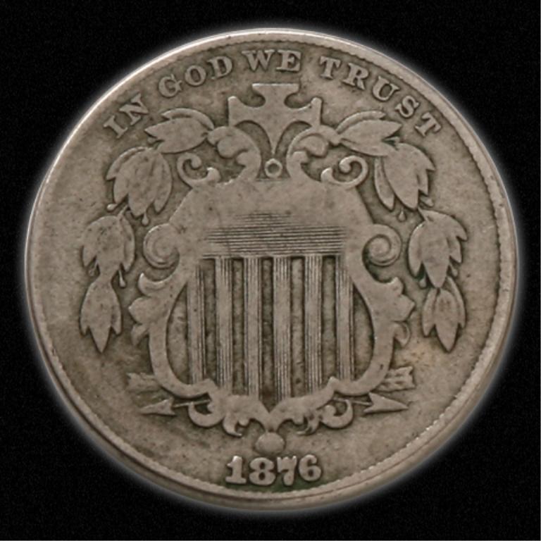 First U.S. Nickel Coin With a face value of Five Cents-Struck from 1866 to 1883-Fine Condition. The Shield Nickel was the first nickel coin with a value of five cents to be released by the U.S. Mint for circulation. Produced from 1866 to 1883, this historic coin was struck only at the Philadelphia Mint. Its obverse features a shield with the cross of the Order of Calatrava (one of the first military orders) flanked by wreaths on both sides. The reverse depicts a large numeral five surrounded by 13 stars and 13 rays.