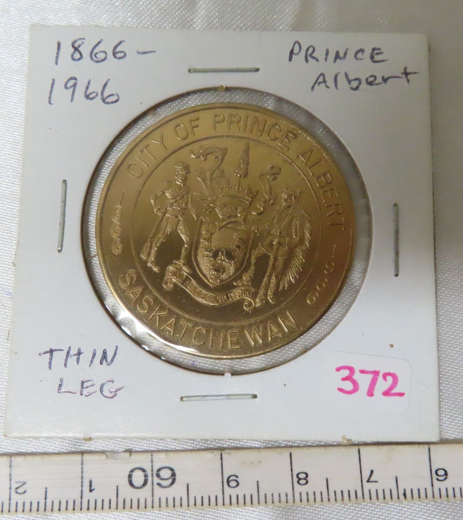 1866 – 1966 Prince Albert, Sask. Centennial Trade Dollar. First Nations Chief has thin leg.