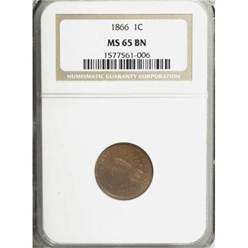 <B>1866 1C MS65 Brown NGC.</B></I> NGC Census: (33/7). PCGS Population (10/1). Mintage: 9,826,500. Numismedia Wsl. Price for NGC/PCGS coin in MS65: $725. (#2085)<BR><BR><B>Coin Engraver:</B> James B. Longacre<BR><BR><b>Shipping:</b> Coins & Currency (<a target="_blank" href="http://www.heritageauctions.com/common/shipping.php">view shipping information</a>)