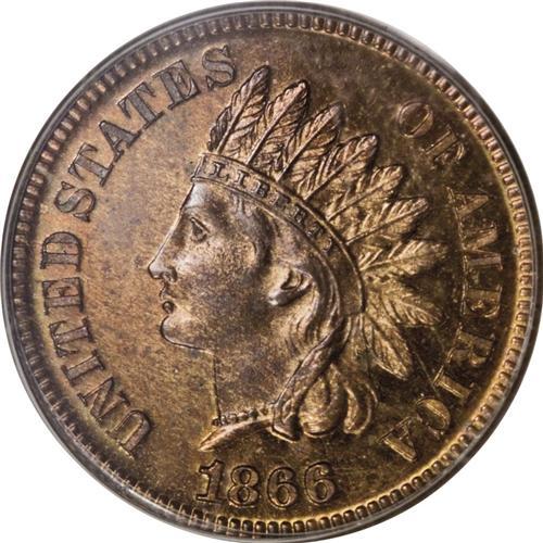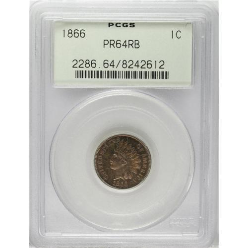 1866 1C Indian Cent PR64 Red and Brown PCGS. A needle-