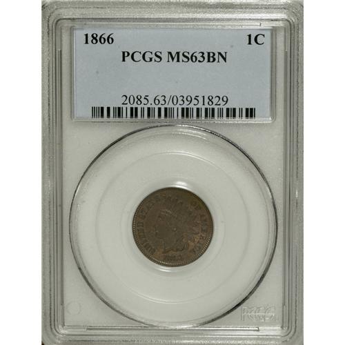 <B>1866 1C MS63 Brown PCGS.</B></I> Ex: August 1986 Coin Galleries Sale, Lot: 2395. PCGS Population (35/45). NGC Census: (54/96). Mintage: 9,826,500. Numismedia Wsl. Price: $256. (#2085)<BR><BR><b>Shipping:</b> Coins & Currency (<a target="_blank" href="http://www.heritageauctions.com/common/shipping.php">view shipping information</a>)