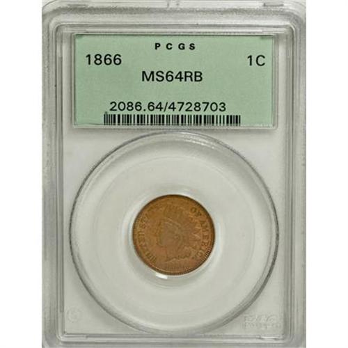 <B>1866 1C MS64 Red and Brown PCGS.</B></I> An attentively struck and gently shimmering near-Gem whose unabraded fields and devices ensure the eye appeal. The reverse has minor carbon at 4 and 10 o'clock. Encapsulated in a green label holder.<BR><BR><B>Coin Engraver:</B> James B. Longacre<BR><BR><b>Shipping:</b> Coins & Currency (<a target="_blank" href="http://www.heritageauctions.com/common/shipping.php">view shipping information</a>)