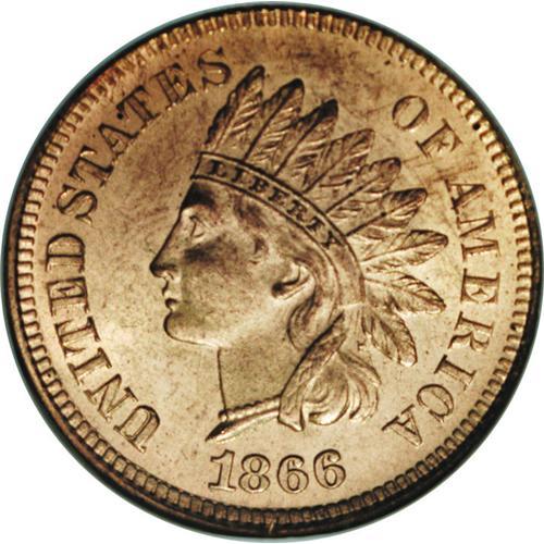 <B>1866 1C MS65 Red NGC.</B></I> Although this early bronze Cent boasts a respectable (for the era) original mintage of 9.8 million pieces, fully lustrous Gems are few and far between in today's market, as one might expect from the available population figures. Softly frosted in texture, this lustrous representative displays even red-bronze color over fully brought up devices. Essentially distraction-free, as one would expect for the MS65 level of preservation. Struck from slightly rotated dies. Census: 12 in 65, 1 finer (11/06).<BR><BR><b>Shipping:</b> Coin/Currency (<a target="_blank" href="http://www.heritageauctions.com/common/shipping.php">view shipping information</a>)