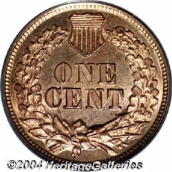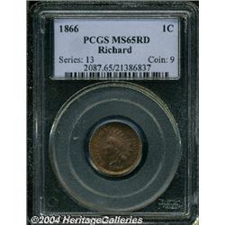 <B>1866<1C> MS65 Red PCGS.</B></I> Ex: Richard Collection. Although this early bronze Cent boasts a respectable (for the era) original mintage of 9.8 million pieces, fully lustrous Gems are few and far between in today's market. They are also few and far between in our auctions, with only six other so graded examples being offered over the past ten years. Softly frosted in texture, this lustrous representative displays cherry-red color over fully brought up devices. Nearly distraction-free, as one would expect for the MS65 level of preservation. Population: 25 in 65, 5 finer (9/04). <BR><BR><B>Important notice:</B> Heritage usually auctions material at the rate of 200-250 lots per hour. On some occasions eBay Live bid software or the Internet may not be able to keep up with the pace of the auction. We recommend placing a realistic absentee bid now as insurance to avoid disappointment. Occasionally the auctioneer may eliminate or reject an eBay Live bid, and the auctioneer may also reopen a lot after the close of the eBay live bidding (usually because we missed an audience bid), and may reject your bid even if it shows you as the winning bidder. By bidding via eBay Live, you agree that Heritage may award the lot to another bidder at its sole discretion under the circumstances described above or any other reasonable circumstances. Since eBay bids are not shown to us until we open the lot on the floor, we treat those bids just like floor bids. In most cases the floor responds before the eBay bid is presented to us, due to Internet lag time, so for consistency we have made it a policy that floor bids are always considered first over tie eBay live bids. Also please note that all Heritage lots purchased through eBay Live carry a 20% Buyer's Premium. Please make sure you read the Terms and Conditions before you bid.