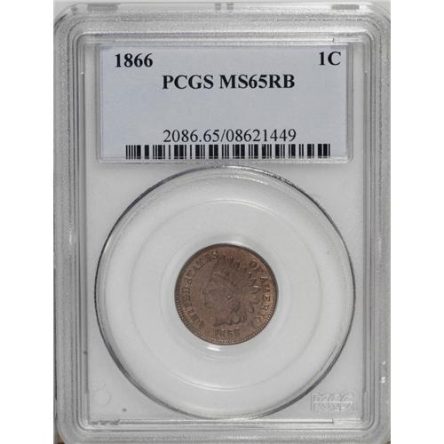 <B>1866<1C> MS65 Red and Brown PCGS.</B></I> While the interiors have toned reddish-brown, the peripheral zones still retain their original orange-copper color. Sharply struck with slight granularity in the fields.