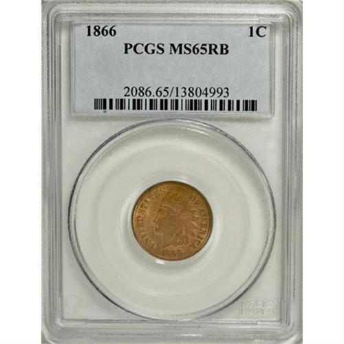 <B>1866 1C MS65 Red and Brown PCGS.</B></I> This early bronze issue's mintage of under 10 million pieces was a steep drop from the production of the previous two years. This predominantly pumpkin-orange Gem shows just a few small hints of mahogany, though these are enough to preclude a Red designation. PCGS has graded just one finer Red and Brown example (8/07).<BR><BR><B>Coin Engraver:</B> James B. Longacre<BR><BR><b>Shipping:</b> Coins & Currency (<a target="_blank" href="http://www.heritageauctions.com/common/shipping.php">view shipping information</a>)