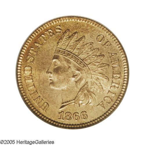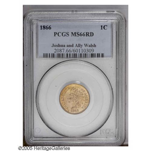 <B>1866<1C> MS66 Red PCGS.</B></I> Ex: Ally Collection. A lovely Gem for the advanced Indian Cent specialist, both sides are aglow in golden-orange luster. The texture is mostly frosty, but a few angles reveal modest hints of brightness in the fields. Neither side reveals any singularly mentionable surface blemishes, and the strike is as close to full as one should expect for the series. Population at both services combined: 6 in 66, none are finer (11/05).<BR><I>From The Joshua and Ally Walsh Collection of United States Cents.</B></I>