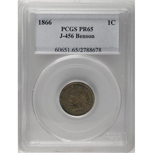 <B>1866<1C> One Cent, Judd-456, Pollock-530, Low R.7, PR65 PCGS.</B></I> Ex: Benson. Regular Indian cent die trials issue. Struck in copper-nickel with a plain edge. Apparently a thin planchet variant, but we cannot be certain because of encapsulation. Mottled olive-gold patina has a muting effect on the proof finish and a paper-thin planchet flaw angles down the lower portion of the portrait. Population: 2 in 65, 0 finer (6/06).