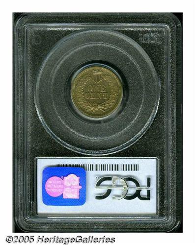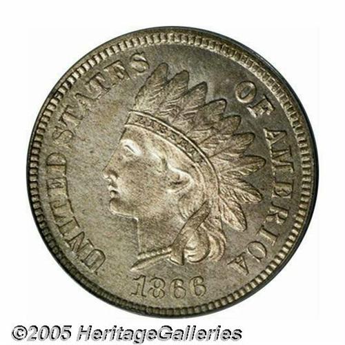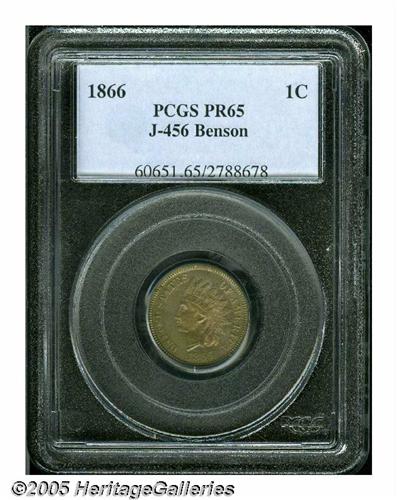 <B>1866<1C> One Cent, Judd-456, Pollock-530, Low R.7, PR65 PCGS.</B></I> Ex: Benson. Regular Indian Cent die trials issue. Struck in copper-nickel with a plain edge. Apparently a thin planchet variant, but we cannot be certain because of encapsulation. Mottled olive-gold patina has a muting effect on the proof finish and a paper-thin planchet flaw angles down the lower portion of the portrait.<BR><I>From The Western Hills Collection.</B></I>