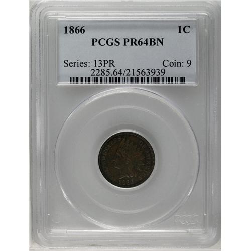 <B>1866<1C> PR64 Brown PCGS.</B></I> Chocolate-brown surfaces with traces of original red. Even without the usual luster, the sharpness of strike makes this specimen an unequivocal proof.