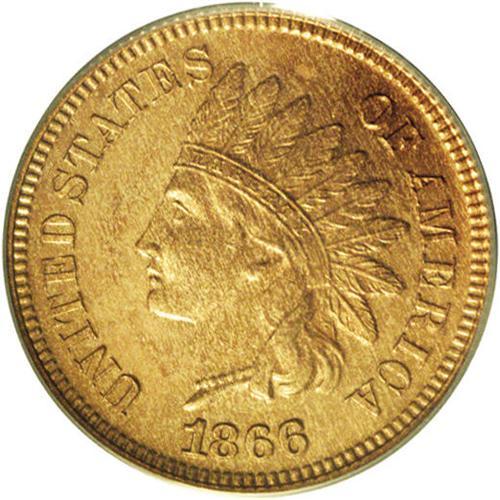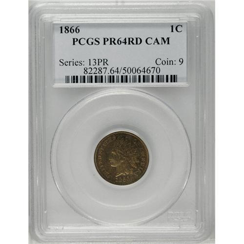 <B>1866<1C> PR64 Red Cameo PCGS.</B></I> A needle-sharp near-Gem with appealing autumn-gold coloration and full, glassy reflective qualities. Minute freckling on the portrait is detected beneath a loupe. 1866 was the first date in the series with a mintage less than 10 million pieces. Population: 3 in 64 Red Cameo, 10 finer (6/06).<BR><I>From The Empire Tree Collection, Part Two.</B></I>