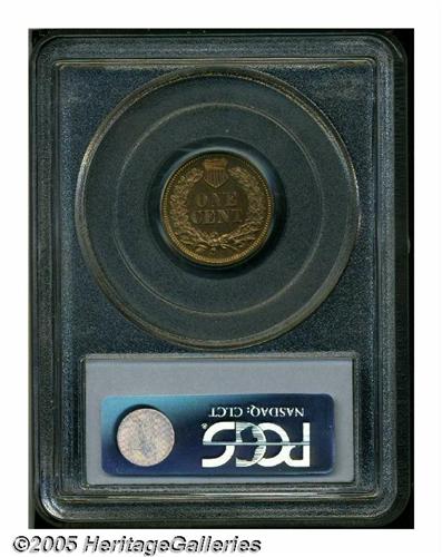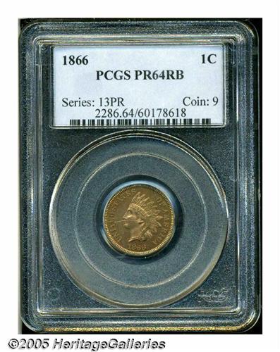<B>1866<1C> PR64 Red and Brown PCGS.</B></I> A flashy near-Gem that comes relatively close to a full Red designation, since the straw-gold color has mellowed only on the cheek. A few tiny toning flecks are on the obverse border. A curious hair-like line is noted across the lower headdress feathers.