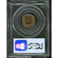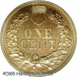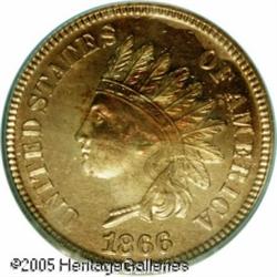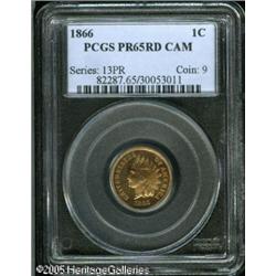 <B>1866 1C PR65 Cameo PCGS.</B></I> Bright golden-red color is seen over each side of this deeply reflective proof, and there is an area of deeper crimson-red at the center of the obverse. Both sides are nicely frosted, a bonus that provides a strong cameo contrast over the splendidly preserved, glassy surfaces. Population: 6 in 65, 3 finer (1/05). Lot:5285