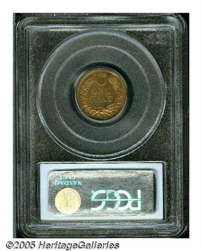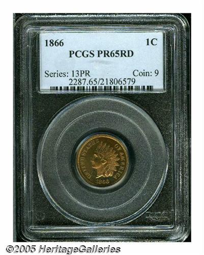 <B>1866<1C> PR65 Red PCGS.</B></I> Orange and gold colors adorn this prominently mirrored and well struck Gem. Only the occasional minute carbon fleck limits the grade. Population: 15 in 65 Red, 3 finer (3/05).
