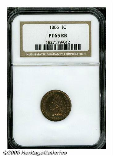 <B>1866<1C> PR65 Red and Brown NGC.</B></I> One of an estimated 725 pieces struck in proof format in 1866. Coppery-gold patina displays accents of cobalt-blue in the central reverse, and the reflective fields offer a nice contrast with the motifs. The design features are exquisitely struck, and there are no mentionable abrasions or spots to report. Population: 36 in 65, 9 finer (3/05).