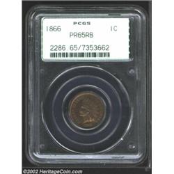 1866 1C PR65 Red and Brown PCGS. A well struck proof Gem with flashy, deep mirrors, and underlying red-orange iridescence.From the Ohio Collection. Important notice: We expect to be auctioning lots at the rate of 200-250 per hour. Sometimes eBay Premier live bid software cannot keep up with that pace, so we strongly recommend that you place a realistic proxy bid now as insurance to avoid disappointment. Also please note that all Heritage/CAA lots purchased through eBay Premier carry a 20% Buyer's Premium. Please make sure you read the Terms and Conditions.