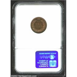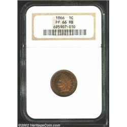 1866 1C PR66 Red and Brown NGC. Razor sharp striking detail is readily evident through an overlay of more or less even glossy-brown patina. The proper light angles also reveal remnants of glowing orange-red luster, but we are unable to locate a single mentionable blemish. A low pop issue at this level, the 1866 is also a challenging bronze Indian Cent to locate as a high grade business strike. NGC and PCGS combined have seen only 11 examples in PR66 Red and Brown, and none are finer with this color designation (10/02).From the "Newmismatist" Collection. Important notice: We expect to be auctioning lots at the rate of 200-250 per hour. Sometimes eBay Premier live bid software cannot keep up with that pace, so we strongly recommend that you place a realistic proxy bid now as insurance to avoid disappointment. Also please note that all Heritage/CAA lots purchased through eBay Premier carry a 20% Buyer's Premium. Please make sure you read the Terms and Conditions.