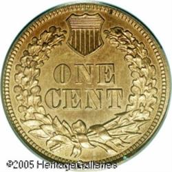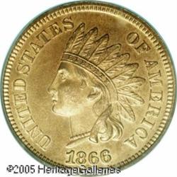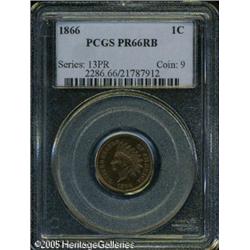 <B>1866 1C PR66 Red and Brown PCGS.</B></I> A desirable Premium Gem specimen that is quite reflective beneath mottled glossy-brown patina. The underlying surfaces are distraction-free, including no unsightly carbon. Population: 4 in 66, 0 finer (1/05). Lot:5283