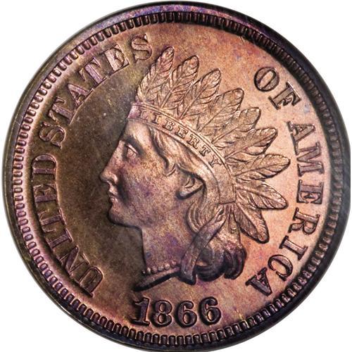 <B>1866 1C PR66 <img border='0' src='http://www.heritagecoins.com/images/star.gif' width=10 height=10> Red and Brown Cameo NGC.</B></I> Vivid magenta, peach, and violet patina graces the surfaces of this gleaming and vibrant Premium Gem. Boldly impressed devices only enhance the eye appeal, and the reason for this piece's Star Designation is no mystery. A few incidental points of contact in the left obverse field account for the grade.<BR><BR><b>Shipping:</b> Coin/Currency (<a target="_blank" href="http://www.heritageauctions.com/common/shipping.php">view shipping information</a>)