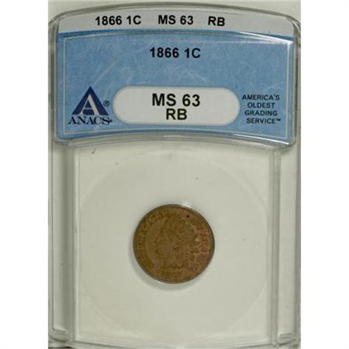 <B>1866 1C MS63 Red and Brown ANACS.</B></I> NGC Census: (34/242). PCGS Population (69/240). Mintage: 9,826,500. Numismedia Wsl. Price for NGC/PCGS coin in MS63: $340. (#2086)<BR><BR><B>Coin Engraver:</B> James B. Longacre<BR><BR><b>Shipping:</b> Coins & Currency (<a target="_blank" href="http://www.heritageauctions.com/common/shipping.php">view shipping information</a>)