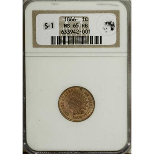 <B>1866 1C MS65 Red and Brown NGC.</B></I> Eagle Eye Photo Seal. S-1, FS-007.6. LIBERTY is strongly die doubled, a 1 is misplaced within the bead necklace, and the tops of two 6s are visible in the denticles beneath the first 6. NGC Census: (100/21). PCGS Population (54/1). Mintage: 9,826,500. Numismedia Wsl. Price for NGC/PCGS coin in MS65: $975. (#2086)<BR><BR><B>Coin Engraver:</B> James B. Longacre<BR><BR><b>Shipping:</b> Coins & Currency (<a target="_blank" href="http://www.heritageauctions.com/common/shipping.php">view shipping information</a>\)