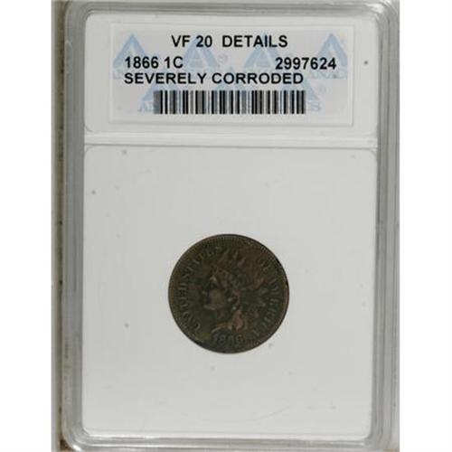 <B>1866 1C --Severely Corroded--ANACS. VF20 Details.</B></I> NGC Census: (0/0). PCGS Population (1/258). Mintage: 9,826,500. Numismedia Wsl. Price for NGC/PCGS coin in VF20: $85. (#2085)<BR><BR><B>Coin Engraver:</B> James B. Longacre<BR><BR><b>Shipping:</b> Coins & Currency (<a target="_blank" href="http://www.heritageauctions.com/common/shipping.php">view shipping information</a>)