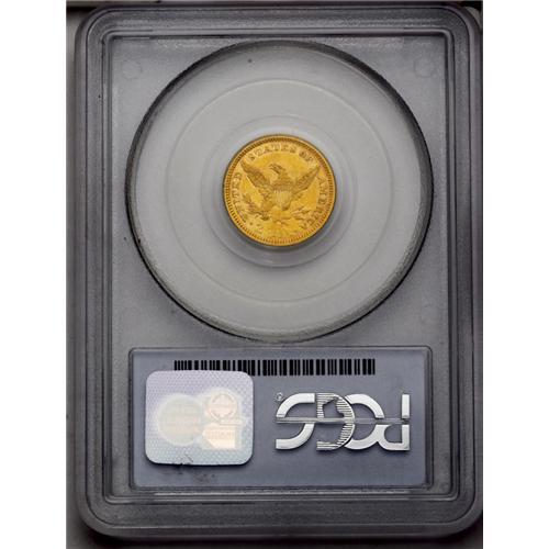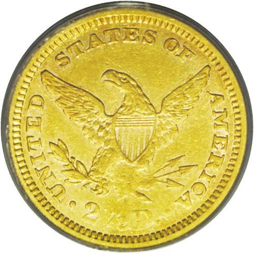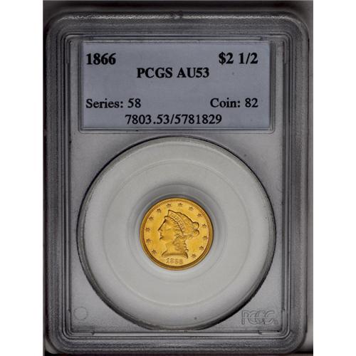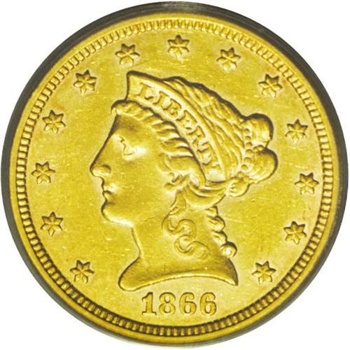 <B>1866<$2 1/2> AU53 PCGS.</B></I> An unevenly struck example that has only a hint of rub on the devices and in the fields. Notable weakness is seen at the base of the eagle on the reverse. The surfaces are minimally unabraded, save for a few marks in the field behind Liberty's head. All Philadelphia Mint quarter eagles between 1863 and 1872 are great rarities. None of these issues has a mintage above 5,300 pieces. Gold coins generally did not circulate in most of the U.S. during this era as paper money traded at a discount to coin. Only 3,080 1866 quarter eagles were minted for circulation, only a few dozen of which have survived in any grade. The median grade appears to be AU50. Population: 3 in 53, 5 finer (5/06).