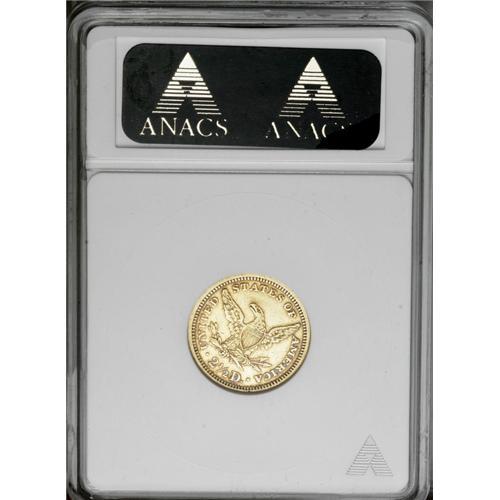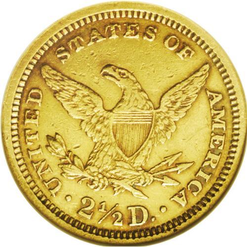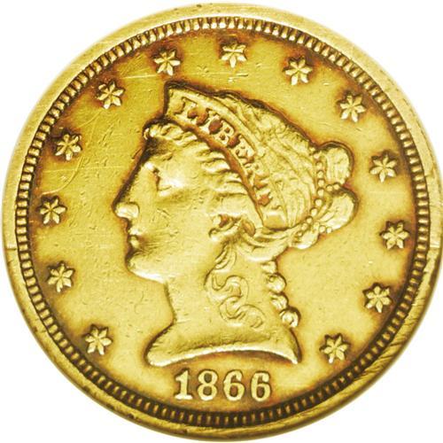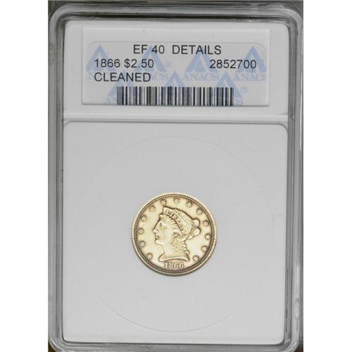 <B>1866<$2 1/2>--Cleaned--ANACS. XF40 Details.</B></I> Well struck with even wear and no harsh contact marks from circulation. An obviously cleaned, copper-gold example, some very deep russet-red color has accumulated around the peripheral areas. This is a rare date in any grade, as it is generally accepted that only about 50-75 coins have survived. The dies have rotated to an almost medallic alignment.