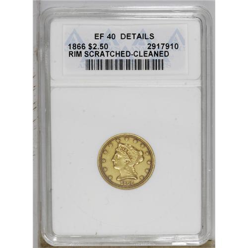 <B>1866 $2 1/2 --Rim Scratched, Cleaned--ANACS. XF40 Details.</B></I> The bright mustard-gold surfaces have light to moderate wear. This survivor, one of just 3,110 pieces coined, has a heavy mark on the rim near 9 o'clock on the obverse.<BR><BR><b>Shipping:</b> Coin/Currency (<a target="_blank" href="http://www.heritageauctions.com/common/shipping.php">view shipping information</a>)